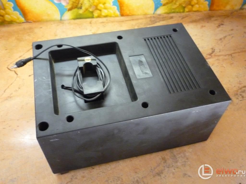 Звук получился более-менее достойный и мощный, для гаража самое оно. Решил заморочиться с корпусом, тут-же в гараже нашёл пластиковую АС по размеру передней панели магнитолы, «болгаркой» пильнул больше половины корпуса. Вырезал окно под панель, радиатор, выключатель, клеммы для АС, зачистил напильником. Трансформатор для усилителя поставил родной с центра, включается через реле от сигнала самой магнитолы. Всё прикрутил где болтиками, а где и термоклеем.