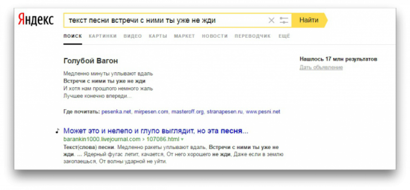 Если с первого раза ничего не нашлось, попробуйте добавить перед фразой слова «текст песни» или «строчка из песни» — так поиск будет проходить более предметно: