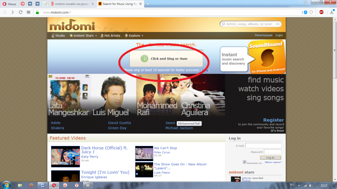 Как видно на рисунке, нужно ввести запрос «Midomi онлайн на русском» и открыть первую же ссылку. Далее на сайте нужно нажать самую кнопку — «click and sing or hum». Она находится вверху окна и снабжена зеленой иконкой поиска — для удобства: