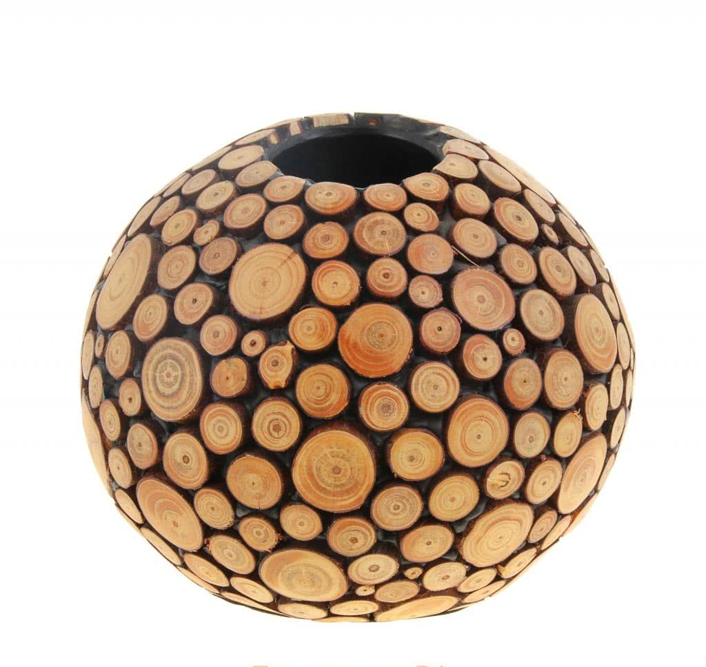 - Эко-стиль. Вам потребуются деревянные срезы небольшого диаметра. Шайбы из дерева следует зачистить наждачкой и посадить на клей в произвольном порядке. Главное, чтобы вся поверхность была в дереве. В местах плавного перехода форм клейте кругляши поменьше, так получится сохранить округлость. Если позволяет интерьер – замените дерево на монеты.
