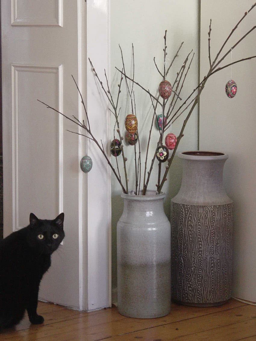 Один из популярных способов окрашивания – спонжинг: краску желаемого оттенка наносим равномерно поролоновой губкой. При желании можно выполнить декупаж готового изделия и нанести декоративный рисунок. Затем покрываем изделие слоем защитного лака. В готовую вазу ставим веточки вербы или сухие цветы. Такая ваза будет прекрасным украшением вашего интерьера.