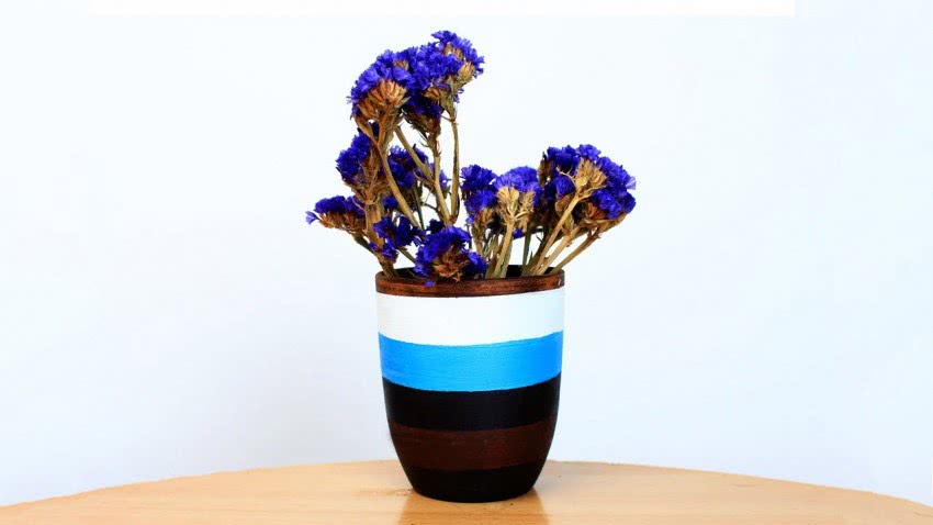 - Окрашивание. Можно покрасить вазон обычным способом – обезжирьте, загрунтуйте поверхность, приложите трафарет и покрасьте. В качестве трафарета можно использовать скотч. Не забудьте в конце зафиксировать все лаком.