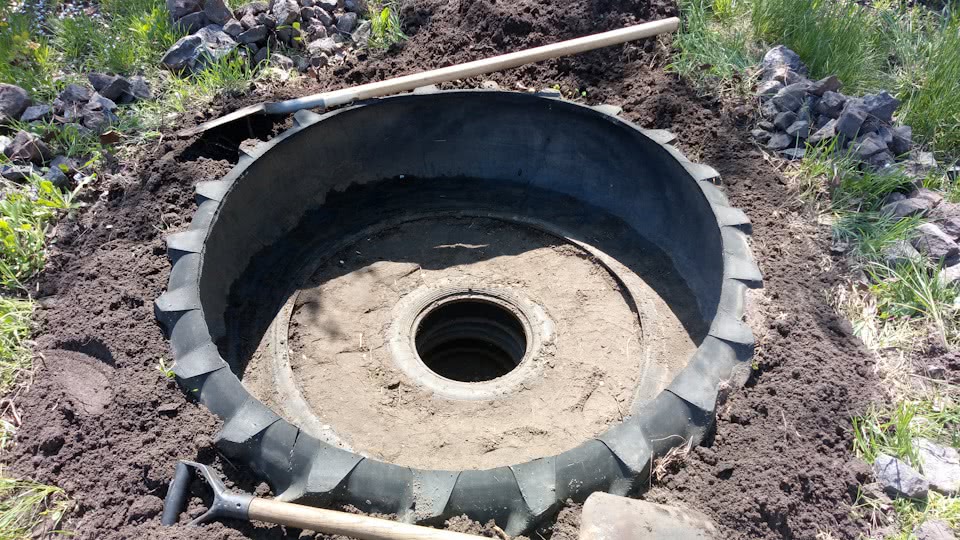 Покрышку разрезают примерно пополам вдоль её плоскости и кладут на бок. Глубокая часть служит каркасом для водоема. Выкапывается яма, которая будет немного больше покрышки. Покрышку плотно укладывается в выкопанную яму и хорошо утрамбовывается.