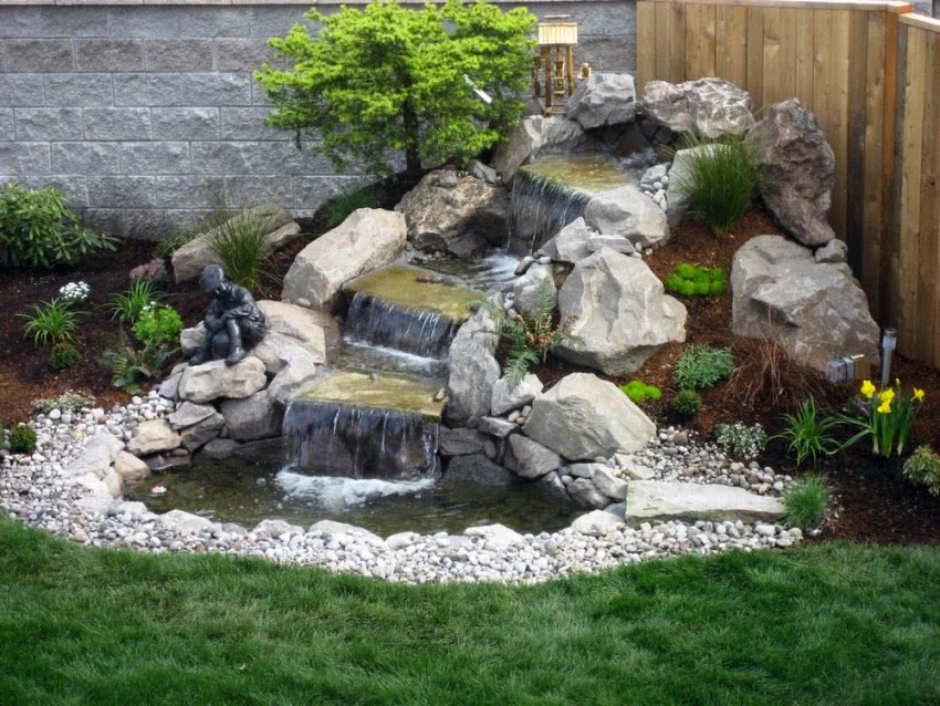 Чем меньше площадь участка, тем скромнее должен быть фонтан. Напротив, большая территория позволяет реализовать целый комплекс со скульптурами, ручьем и водопадом.