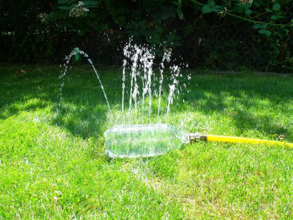 Далее к горлышку бутылку подсоединяют шланг и закрепляют его хомутом или изолентой. Фонтанчик готов, можно включать воду. Такой фонтан отлично подходит для развлечения детей, а также в жаркую погоду освежает участок.