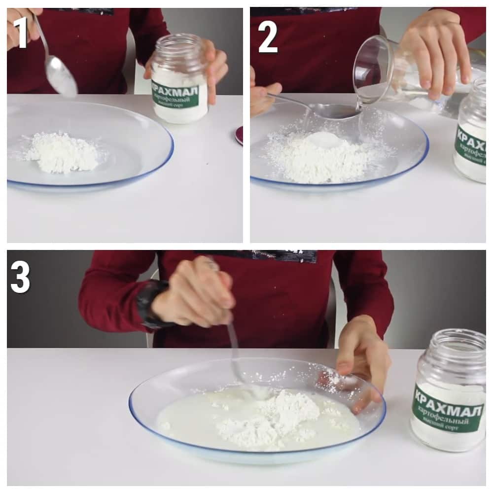 Для более жидкого состояния смеси берется пропорция воды и крахмала 1:1. Для более твердого — 1:2. При желании в нее можно добавить пищевые красители, тогда смесь будет яркой.