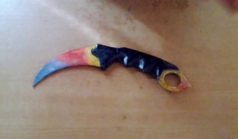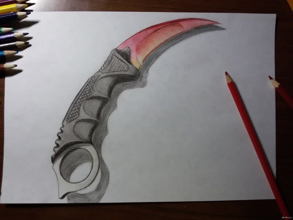 На следующем фото не реальный карамбит, а только карандашный рисунок, но выбор оттенков и реализация замечательны. Мы думаем, что если раскрасить самодельный керамбит из бумаги так же, то получится здорово.
