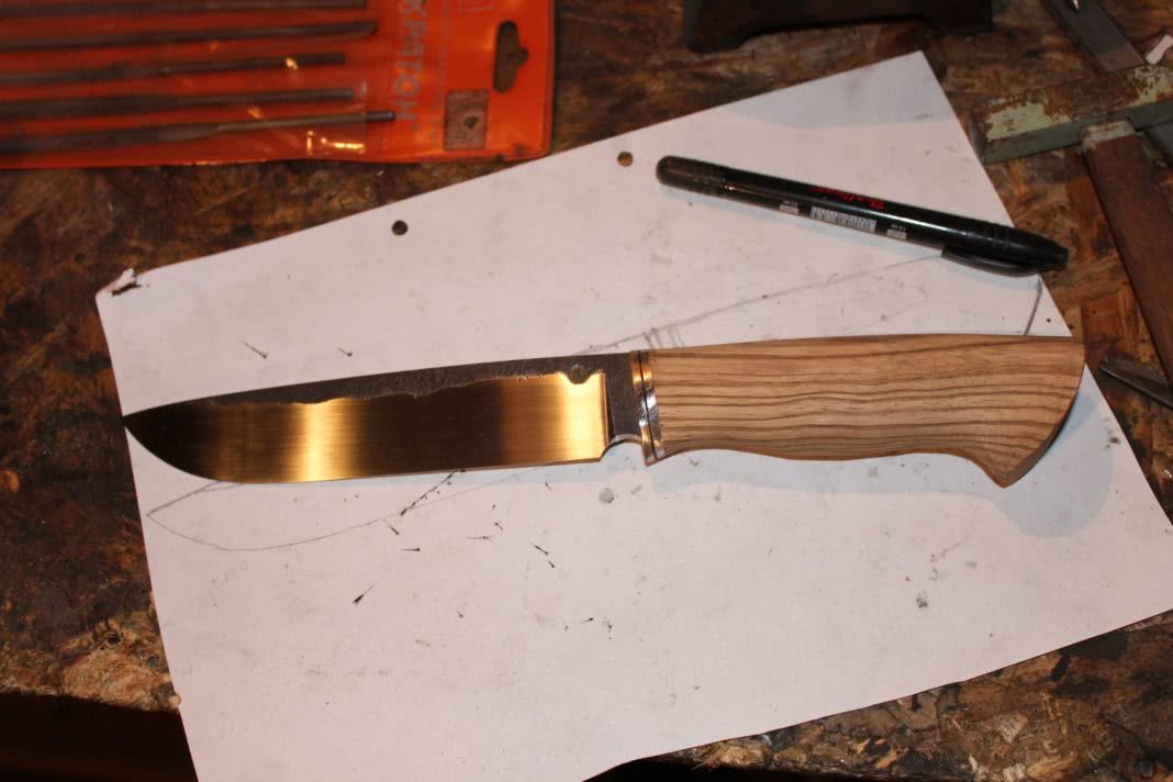 Отдельно следует остановиться на том, как делается ручка. Если используется древесина, то берется монолитный фрагмент, в котором делается продольный пропил и сквозные отверстия. После этого болванка насаживается на клинок, в нем намечаются отверстия для крепежа. Фиксация рукоятки на клинке производится с помощью заклепок или болтов с гайками. В случае с болтовым соединением шляпки метизов утапливаются в древесине и заливаются эпоксидным клеем.