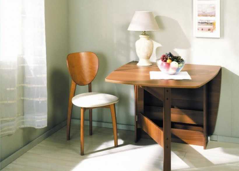 - Откидной. Он представляет собой небольшую столешницу, прикрепленную к стене. В сложенном виде мебель находится в вертикальном положении и не занимает места. В разложенном виде конструкция превращается в столик, который опирается на одну ножку. Его преимущества: компактность, экономия пространства, простой процесс изготовления и монтажа, разнообразие форм. На крепления оказывается большая нагрузка, поэтому прослужат они не очень долго.