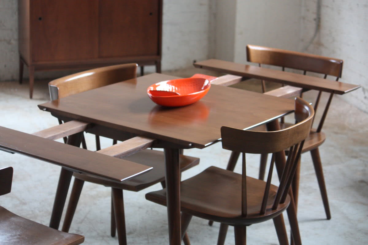 Для стола квадратной формы характерны небольшие размеры, чтобы не затруднять доступ к блюдам. Зачастую его располагают в центре помещения. Такая конструкция будет идеальным вариантом, когда количество персон не превышает 4.