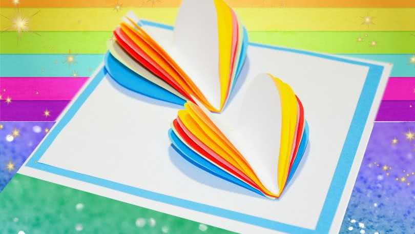 Самые внешние завитки сердец приклеиваются к картонному основанию открытки, на противоположные её части. При открывании образуются объёмные спиралевидные сердечки.