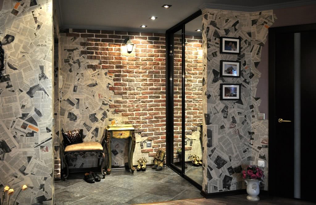 Например, одна сторона оклеивается кирпичным орнаментом, а другая — однотонными обоями. Получается живой и яркий дизайн, который удобен даже в узких коридорах.
