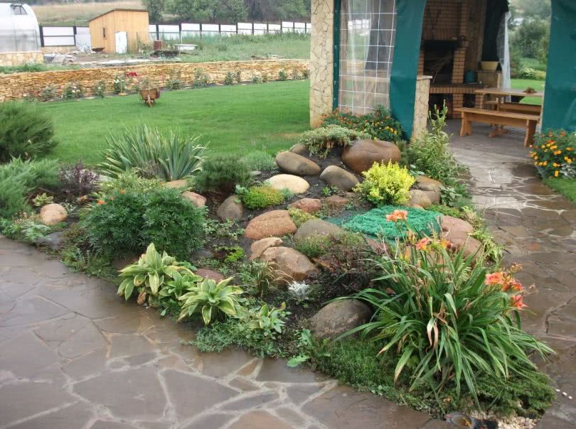 - альпийский — отсутствие заборов и оград, совмещение функциональных зон, использование камней при оформлении участка, хвойные кустарники и многолетние культуры в качестве озеленения;