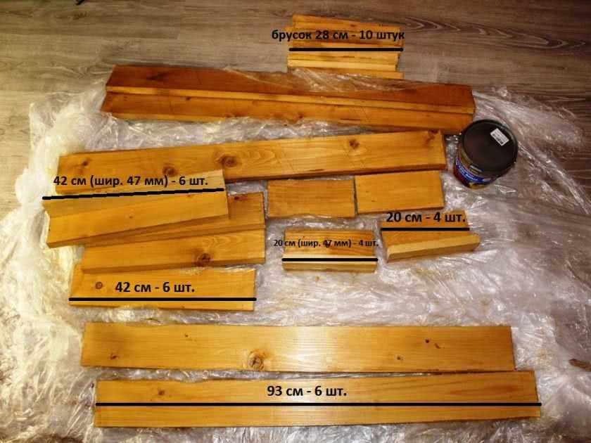 Четырехъярусная этажерка состоит из четырех стоек и восьми поперечных опор для крепления реечек для полок. Двенадцать реечек пойдут на полки. Предварительно все рейки отшлифовать.