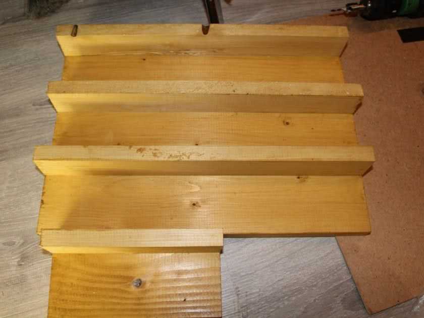 Предварительно планки подогнать под нужный размер, отшлифовать и собрать двухъярусную или трехъярусную полку от потребности в размещении. Затем вскрыть лаком или морилкой, подобрать нужный цвет.