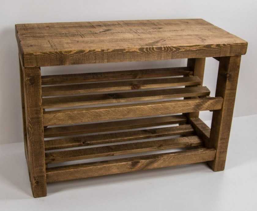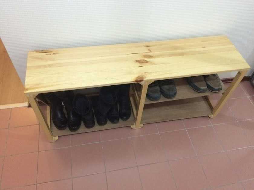 Популярностью пользуется деревянная полка для обуви с сидением. Принцип сборки такой же, как и тумбы, только верхняя сторона сделана скамейкой.
