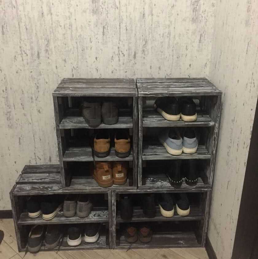 Ещё один вариант полки для обуви из деревянных ящиков, которую можно сделать своими руками.