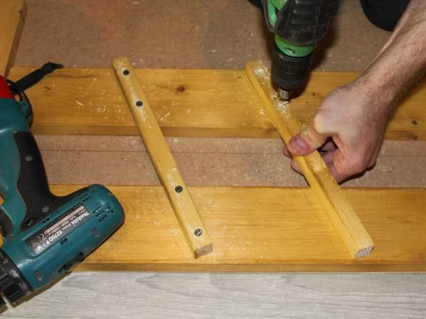 С помощью саморезов собирается вся полка, а для усиления конструкции несущие части скрепляются уголками. Не забудьте покрасить мебель или покрыть её защитным лаком: это убережёт древесину от воздействия влаги.