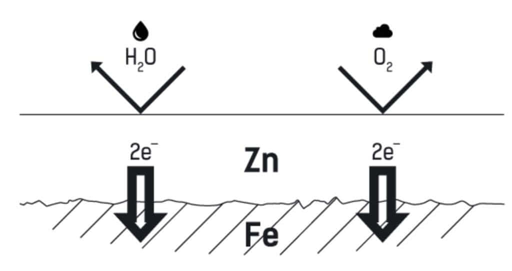 Этот эффект называется электрохимической коррозией, а заключается он в разрушении активного металла при контакте с менее активным, который получает дополнительные ионы и восстанавливается. Если на поверхности оцинкованного листа образуется повреждение до железа, то весь защитный слой может растаять, буквально как снег весной. Активный электрохимический процесс приводит к ускорению окисления обоих металлов.