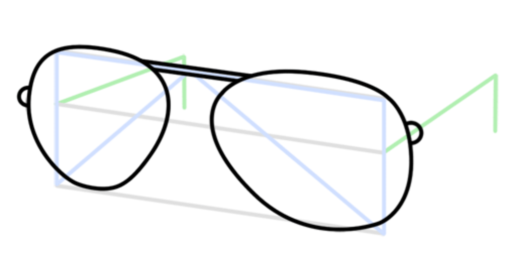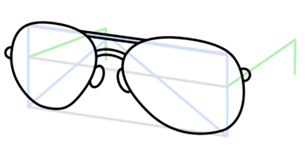 Теперь посмотрим, как нарисовать очки видом сбоку. Для этого нарисуйте форму рассматриваемого предмета, сделав одну сторону меньшей, так как аксессуар находится под углом. То же самое и с дужками, дальняя дуга от вас будет короче, чем ближняя.