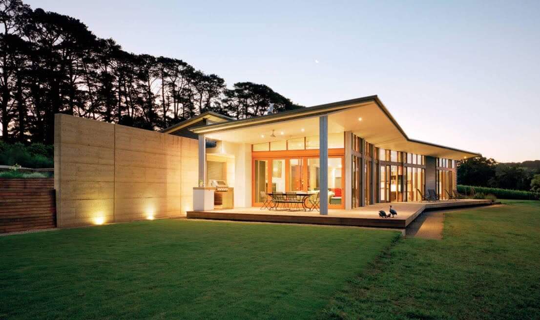 Материал применяют в проектах современной архитектуры – минимализм, хай-тек, индустриальный стиль – где важно акцентировать внимание на простых формах и линиях, а от фасадного декора можно отказаться. Серые бетонные стены можно оставить без отделки, тогда усилится эффект мощного, основательного сооружения. Придать ему визуальную легкость можно панорамным остеклением, как на фото