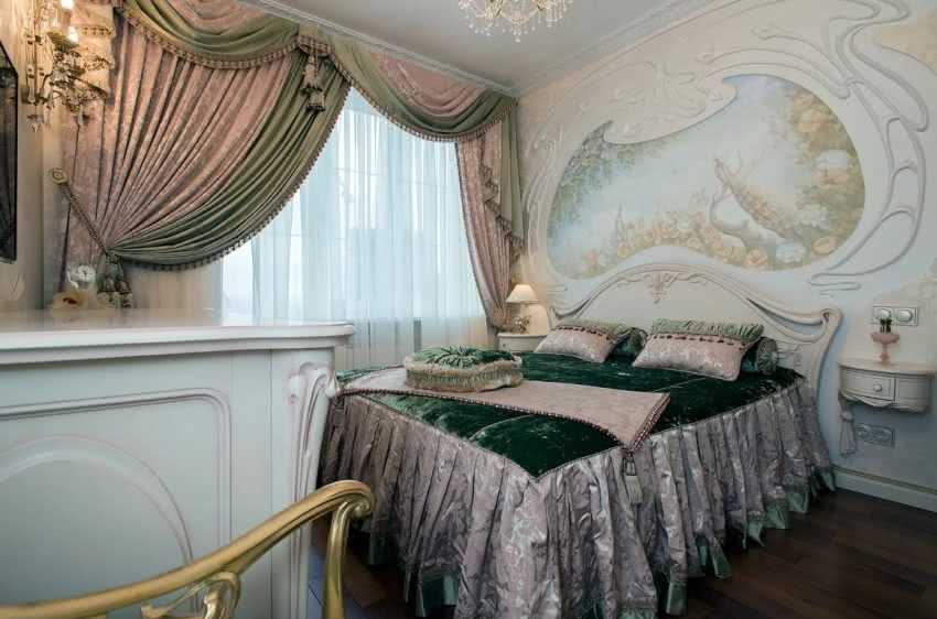 Окно в такой спальне считается важной частью интерьера, оно оформляется с особым вниманием. Важная роль в декорировании отдана текстилю: вычурным ламбрекенам, узорчатым карнизам, подхватам, кистям, бахроме и сложным композициям из разных видов материи