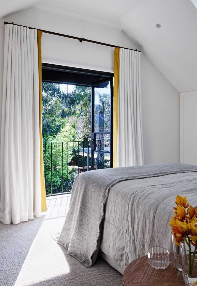 Если из спальни можно выйти на балкон или лоджию, то при выборе подходящего дизайна стоит на это ориентироваться. Конструкция занавесей должна давать возможность распахивать дверь и оставлять проход для человека. В этом может помочь удобный подхват или магнитный держатель.