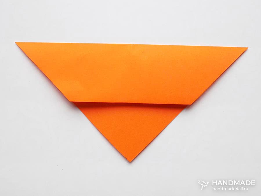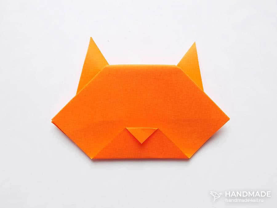 Треугольник складывается пополам и вновь распрямляется, создавая главную линию. Нижние углы подгибают к центру, формируя ушки зверька. Верхнюю часть заворачиваем от себя внизу.