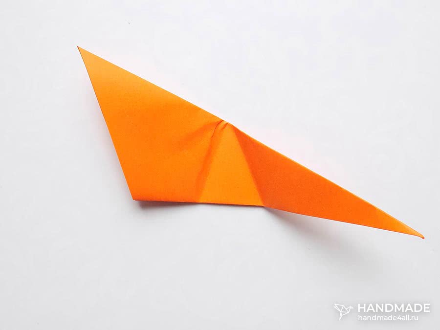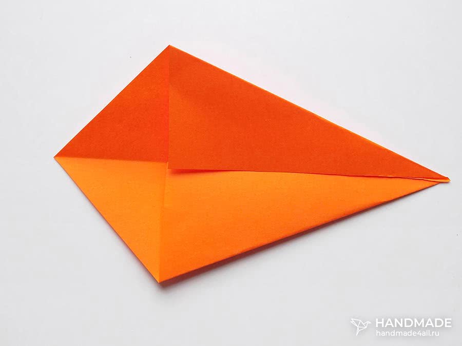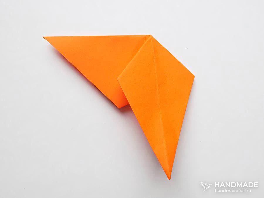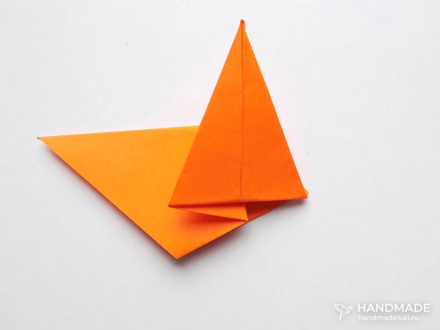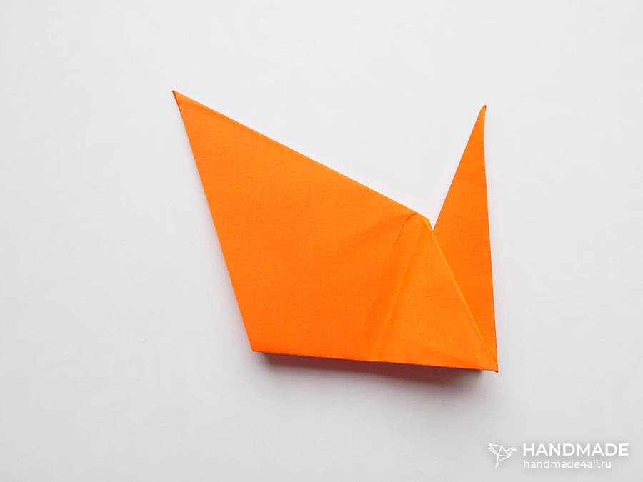 Голова создается аналогичным способом сгибания квадрата по диагонали. Теперь оба угла загибаются к центру основы треугольника.
