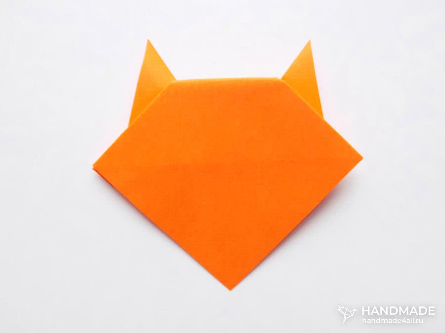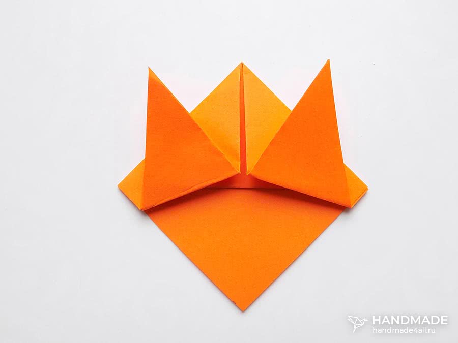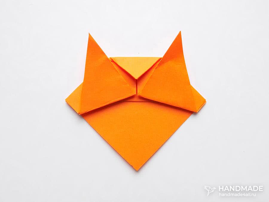 Поверните поделку. Образовавшийся средний прямой угол между двумя острыми углами-ушами заверните на изнаночную сторону, создавая кошачью мордочку.