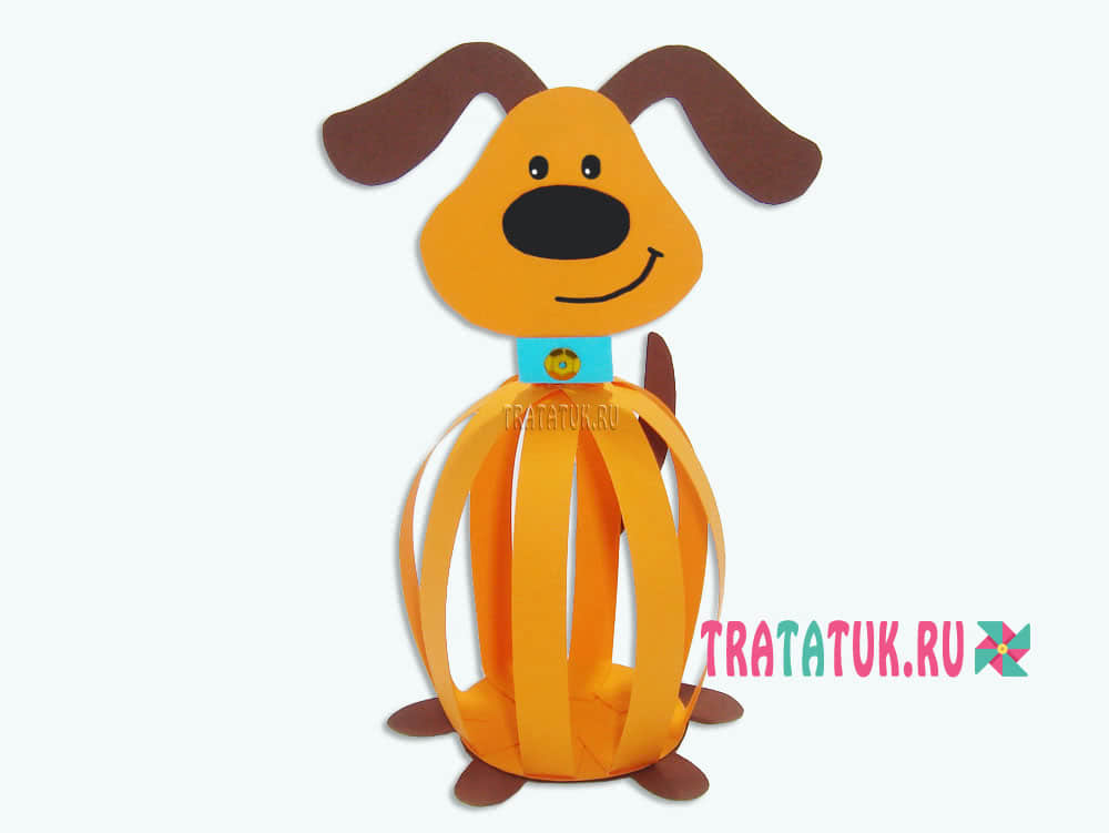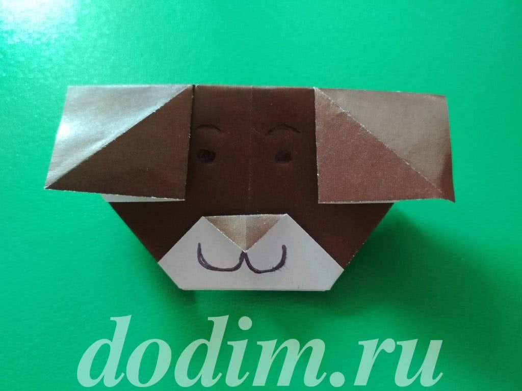 Есть много вариантов собак оригами. Этот идеален для детей. Состоит песик из двух частей – головы и туловища. После простых действий в их создании, части склеиваются вместе.