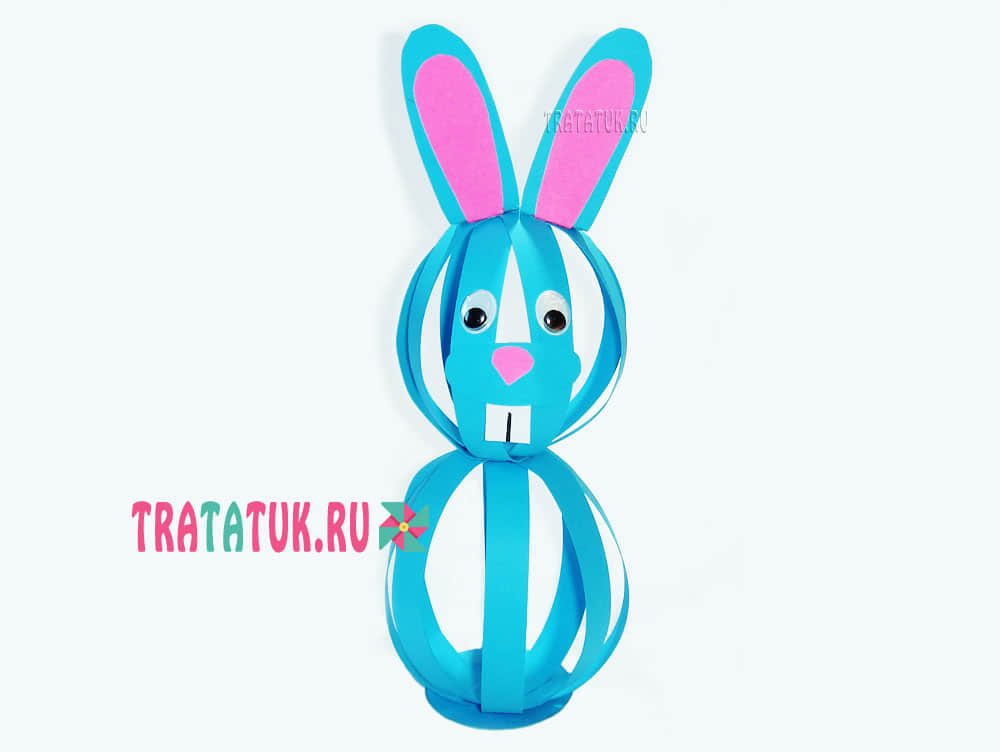 Такой милый зайчишка обязательно понравится детям. Он складывается из двух бумажных квадратов – по отдельности голова и туловище. После их нужно склеить вместе. Совсем несложная работа. В этом можно убедиться следуя ссылке на пошаговый обзор.