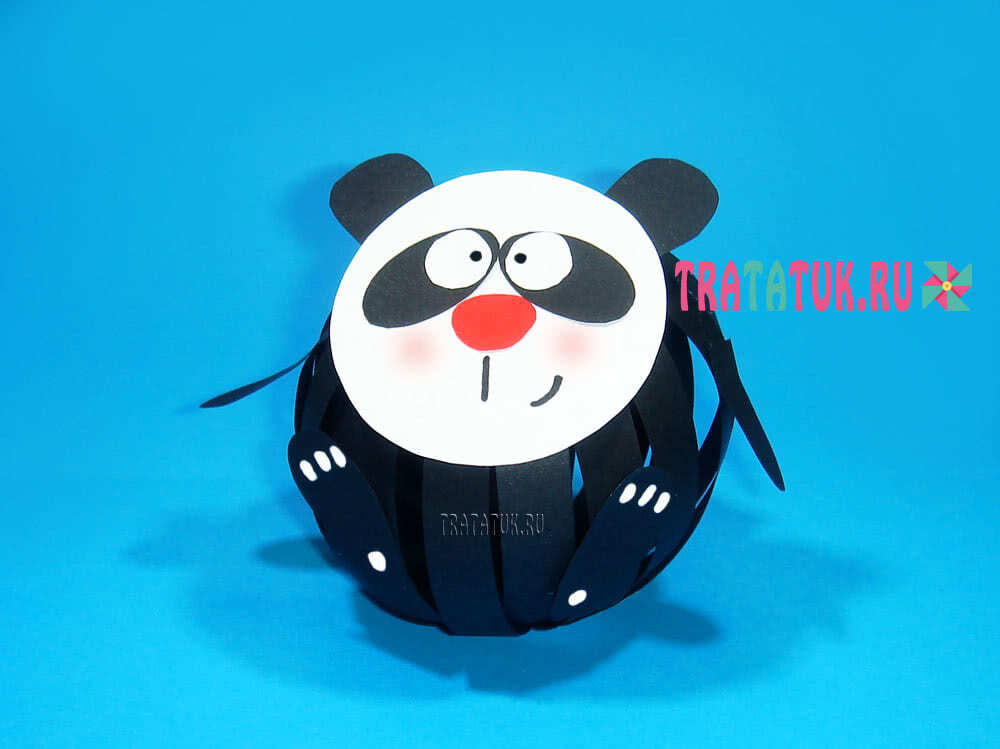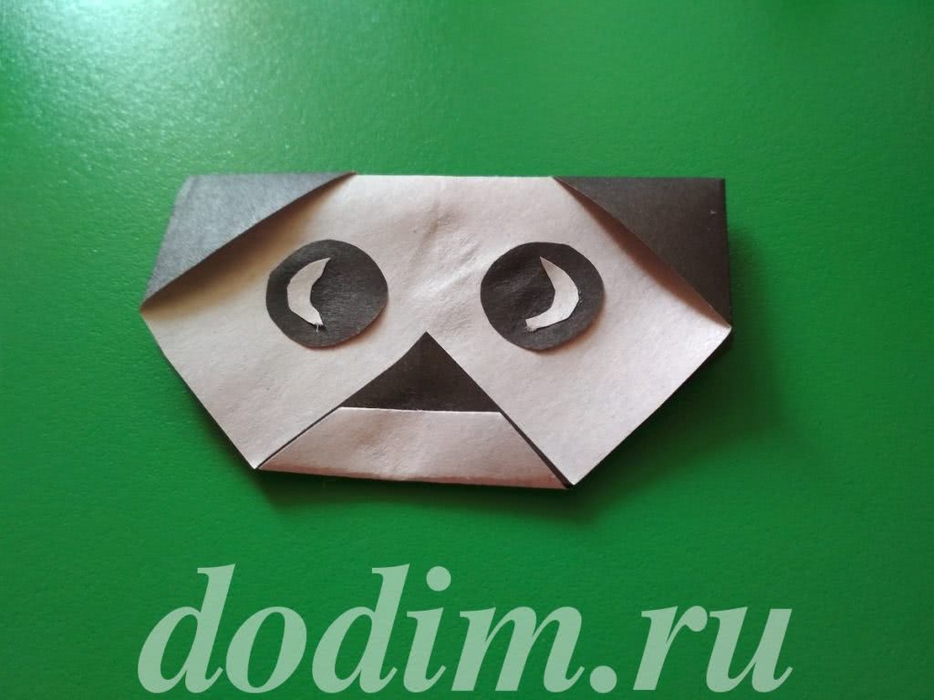 Нижний острый кончик загните вверх. Верхний слой отогните вниз. Спрячьте кончик внутрь. У панды есть черные ушки и носик. Осталось сделать глаза. Вырежьте два круга из черной бумаги и сделайте белые серединки. Приклейте к поделке.