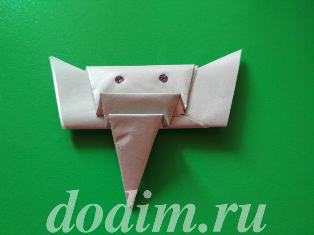 - Закончите хобот, сделав пару складок в верхней части. Бумага складывается «гармошкой».