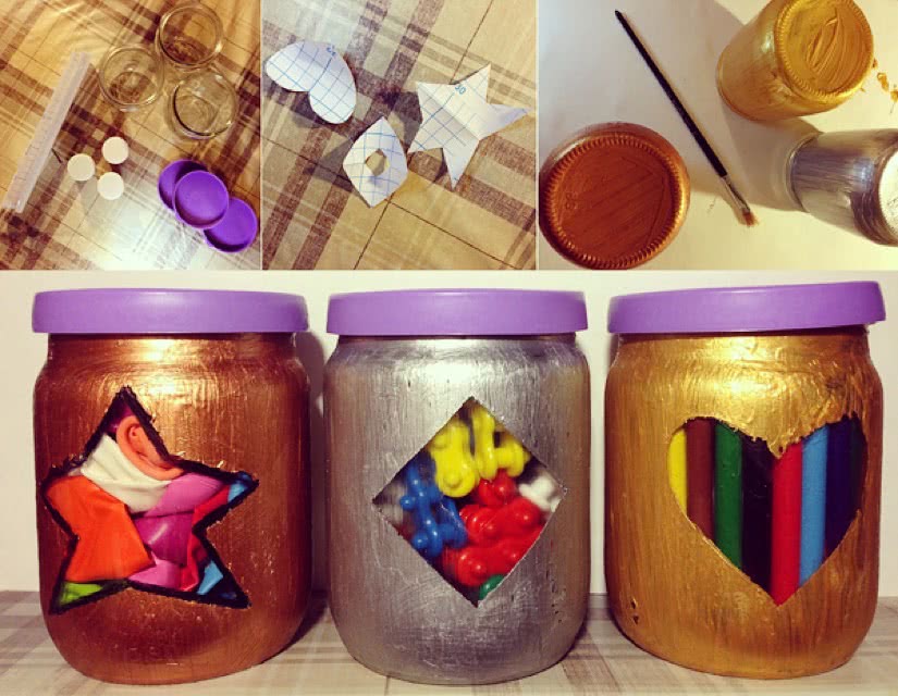Кроме того, можно разукрасить всю баночку, оставив какой-либо рисунок или надпись прозрачными, а заму баночку наполнить конфетами, камешками или т.п. Такая баночка будет очень красиво смотреться.