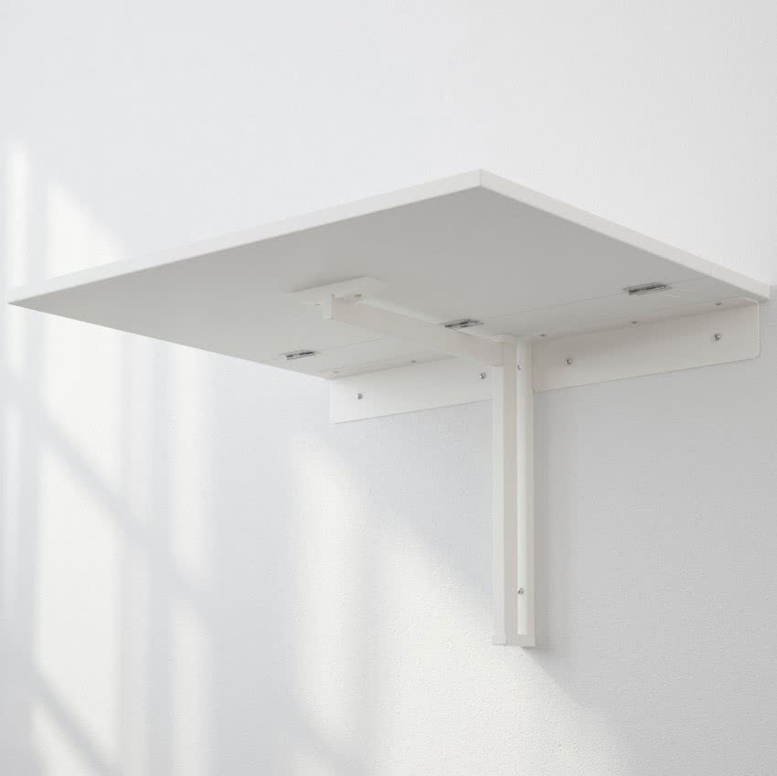 Стандартная конструкция стола состоит из 2 основных деталей — столешницы и креплений (фиксаторов). Первая может быть любой длины, толщина при этом небольшая — практически не отходит от стены. Фиксаторы (треугольные или П-образные опоры) позволяют опускать и поднимать столешницу. Дополнительными элементами конструкции могут служить ножки (опоры) или полочки.