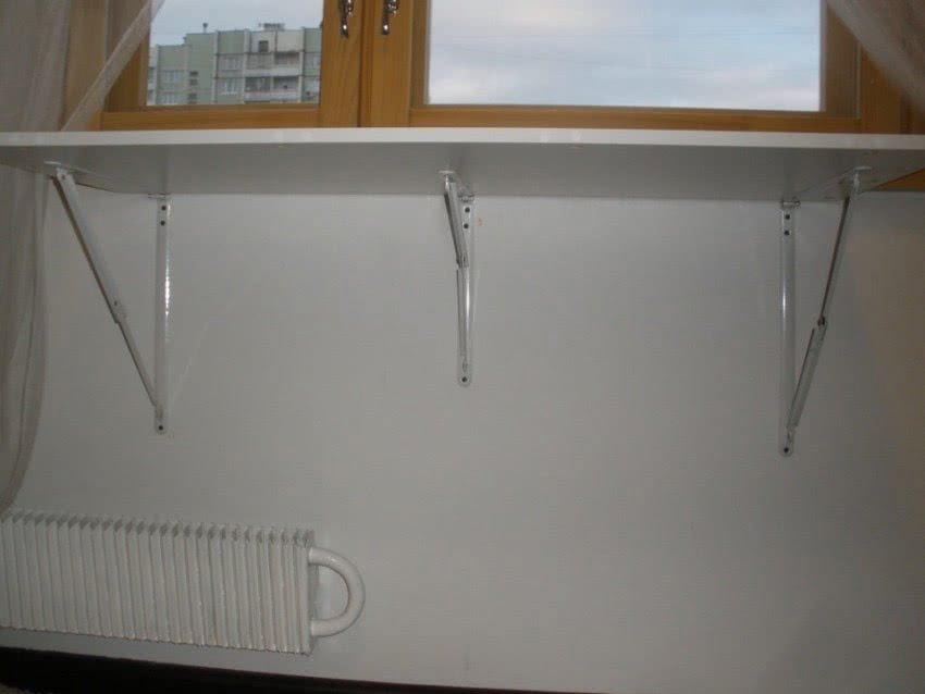Треугольная опора подходит в том случае, если изделие не слишком длинное. Она изготавливается из брусков, которые стягиваются в виде прямоугольного треугольника. Такой кронштейн крепится книзу столешницы при помощи петель. Такой способ фиксации стола не подойдёт, если вы планируете откидной столик установить над батареей, поскольку вся тяжесть конструкции и размещённых на ней предметов ляжет на радиатор. Треугольная косынка подходит замечательно для крепления откидной конструкции к стене. Можно сделать не одну, а две планки и разместить их по бокам стола — так опора будет сильнее.