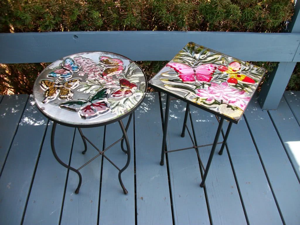 - благодаря прозрачным красителям и трафаретам на стекле создают эффект витража, что позволит столику стать центром композиции на балконе;