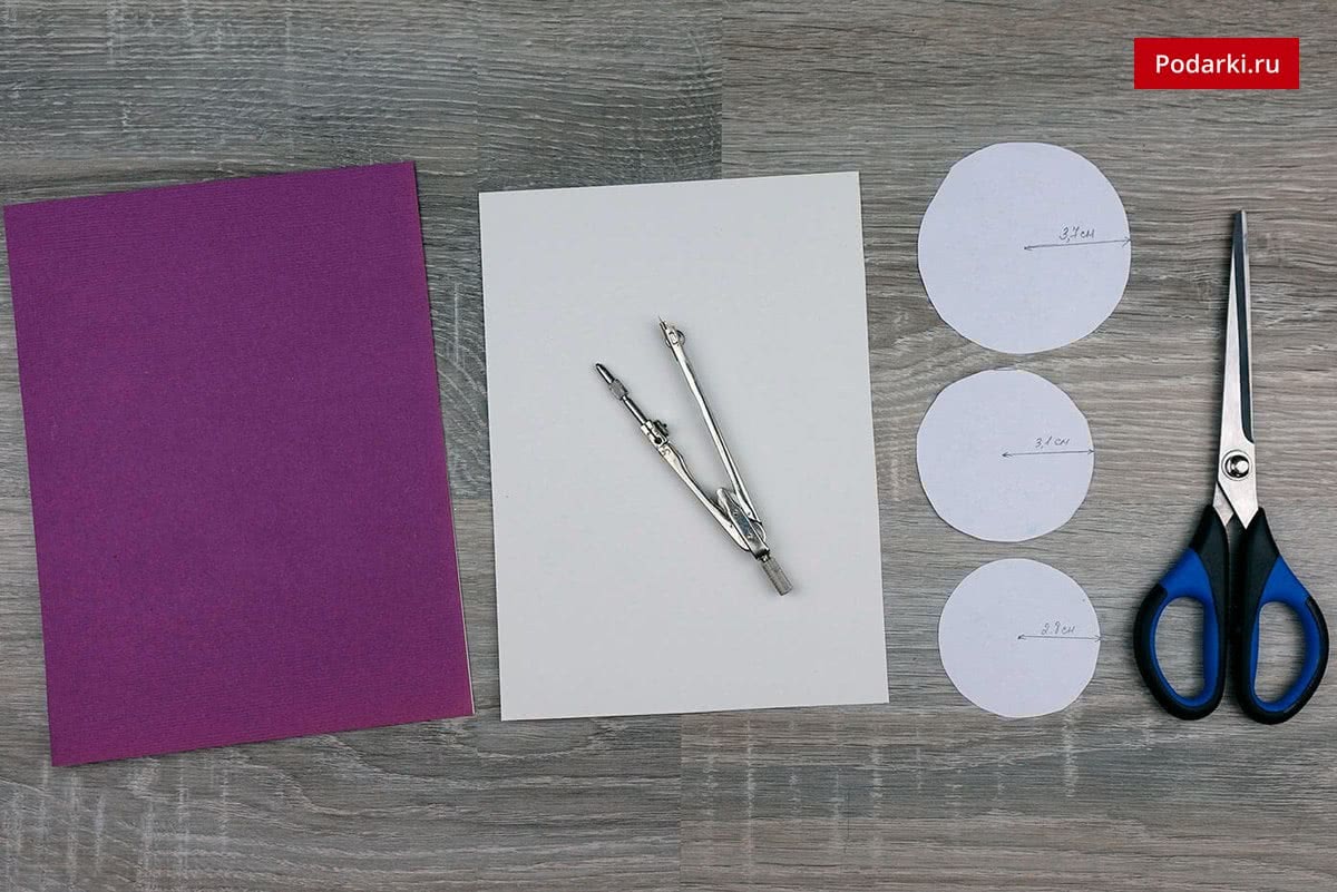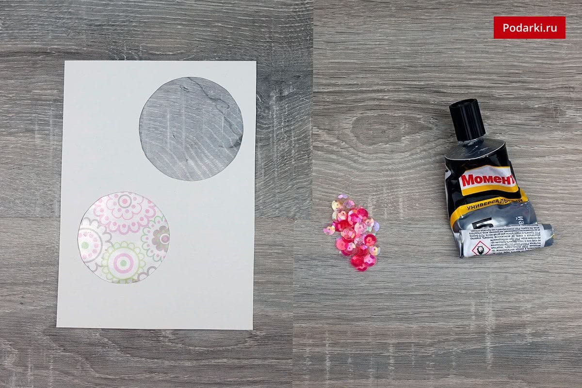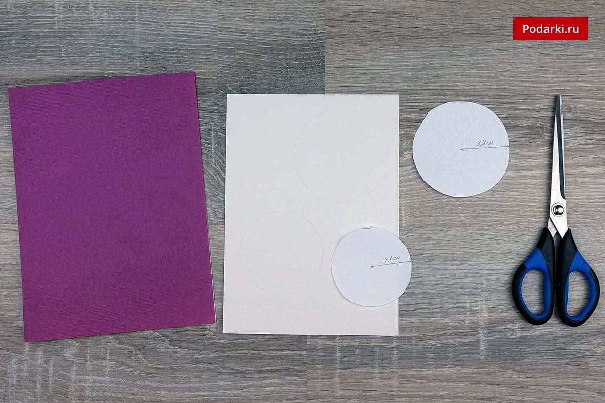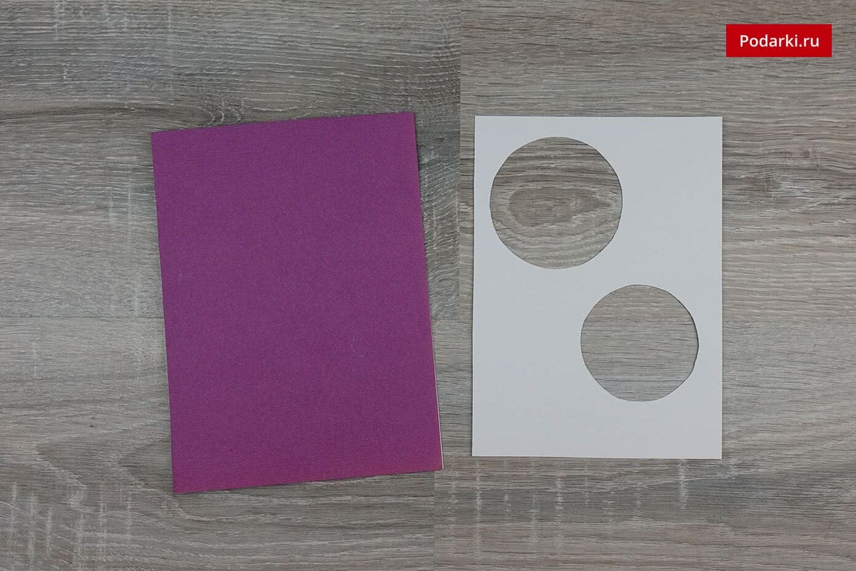 Из картона белого цвета вырезаем прямоугольник на несколько сантиметров меньше, чем открытка. На простой бумаге рисуем циркулем круги и вырезаем их, как показано на фото.