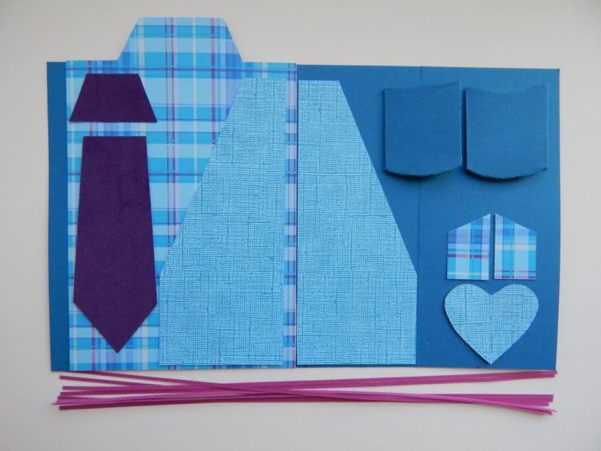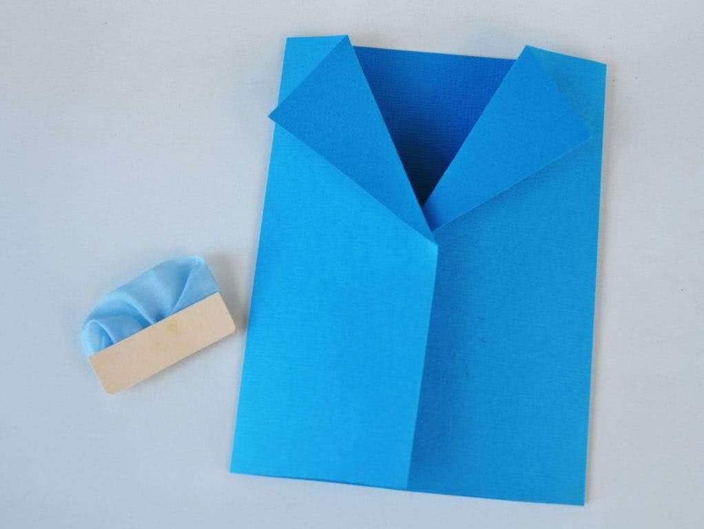 - Белый лист 28х20 см складывается пополам и вкладывается в будущий синий «пиджак»;