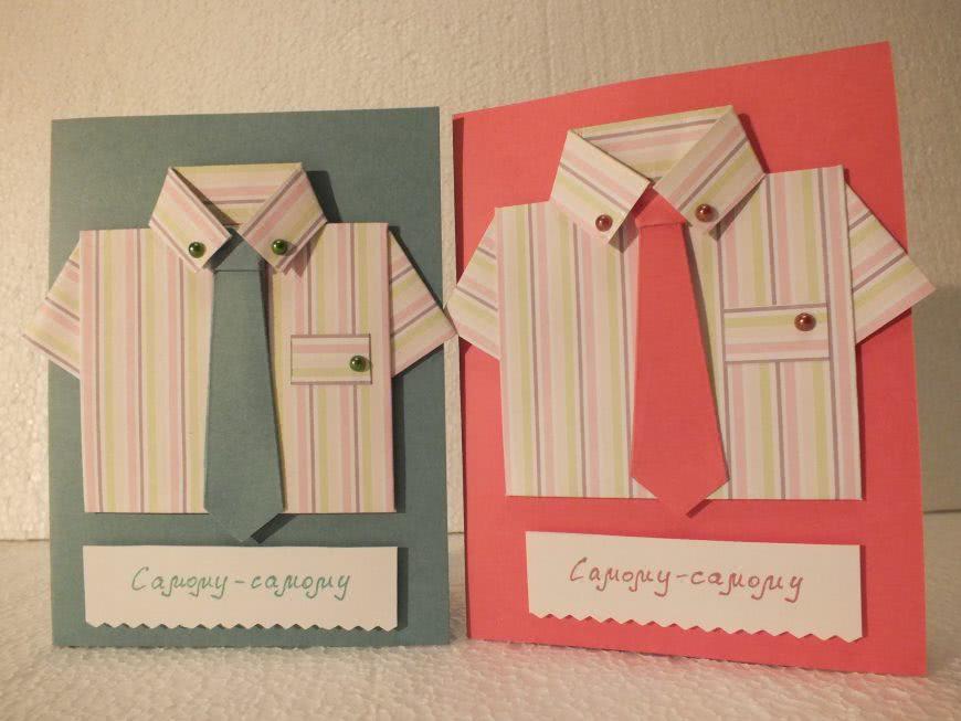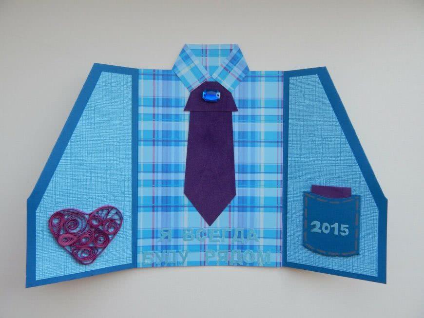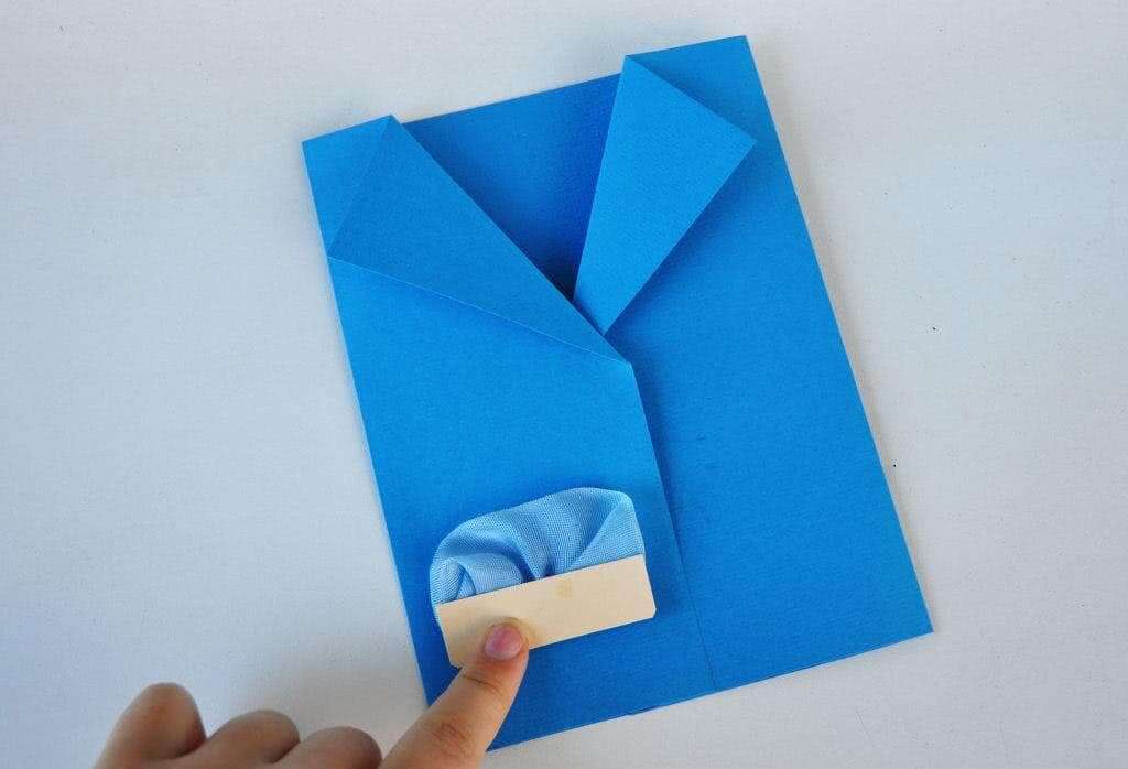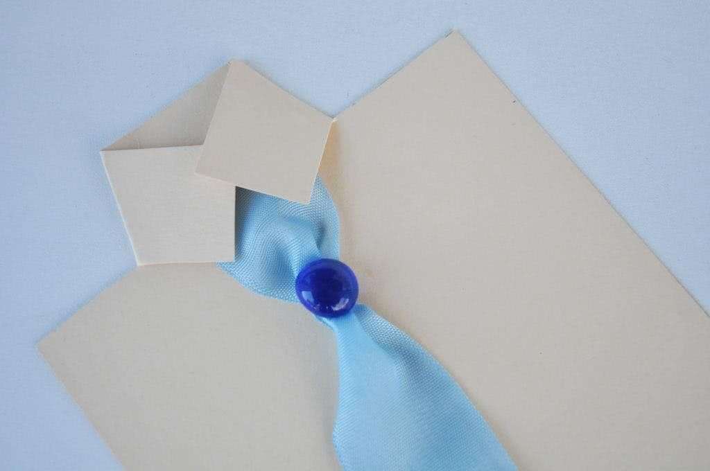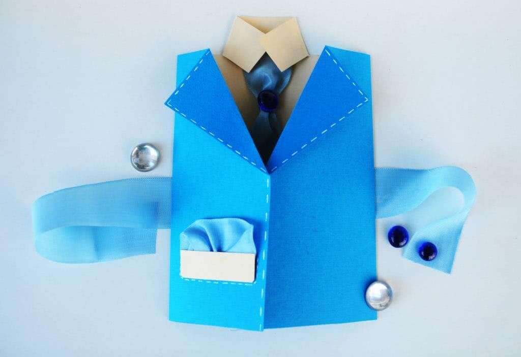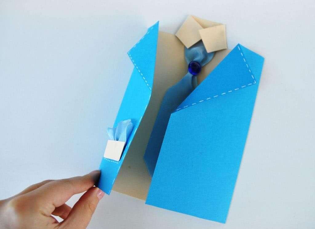 Готовое послание готово к написанию красивого поздравления и декорированию разными рисунками из газет и журналов. После этого его остается погрузить в открытку в виде костюма.