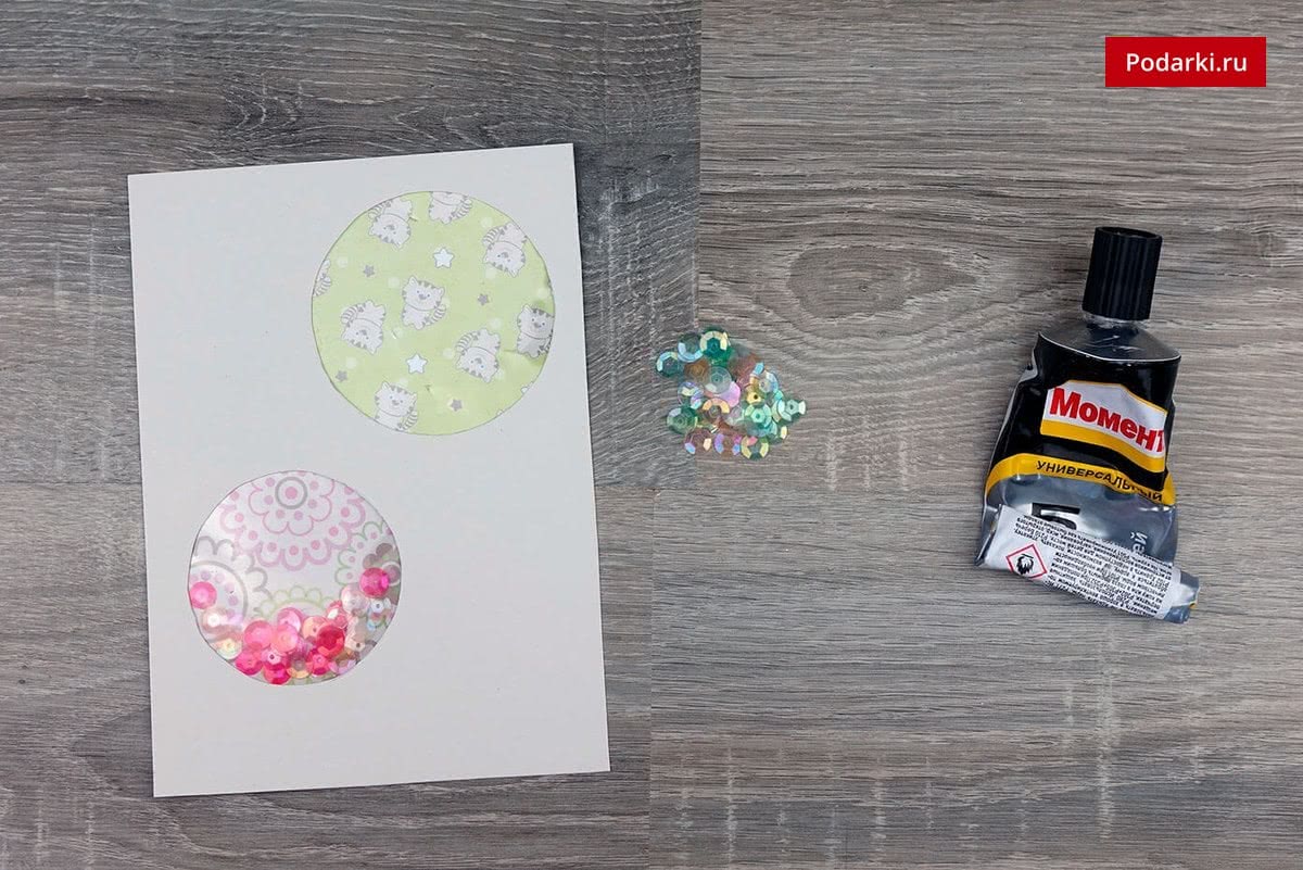Насыпаем в кармашек пайетки другого цвета и заклеиваем отверстие.