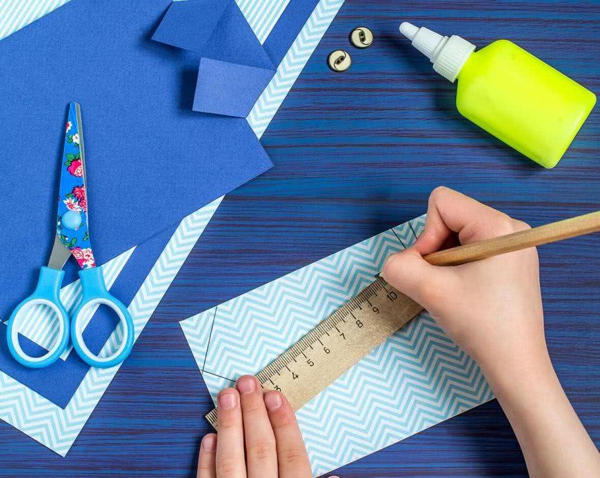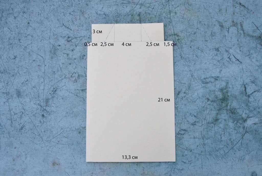 Укорачиваем лист цветной бумаги таким образом, чтобы его длина была не более 18 см. С помощью линейки отмеряем с одной стороны 7,5 см, а с другой 8,5 см. Аккуратно загибаем края по разметке. Отворачиваем верхние углы, как показано на фото.