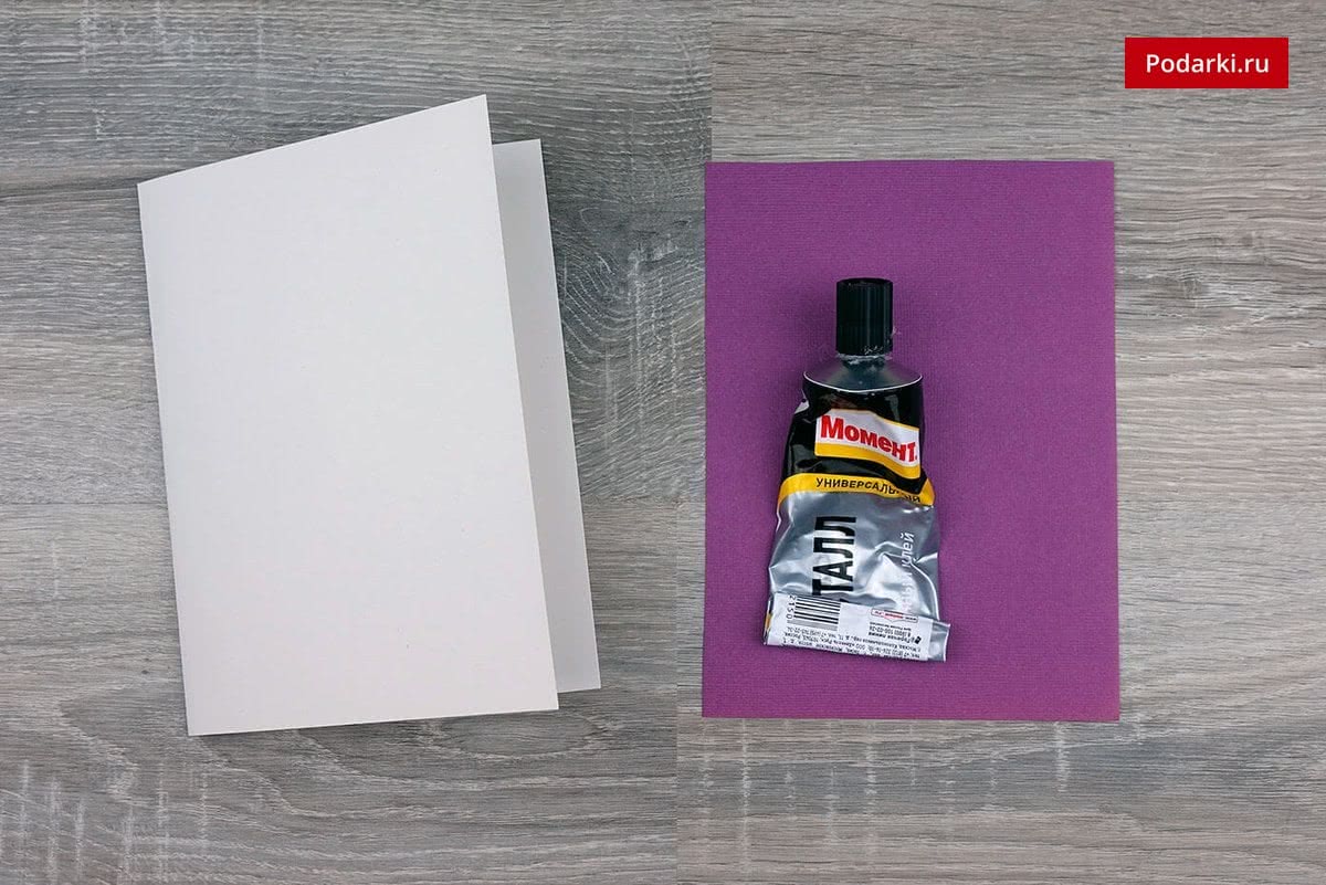 Для создания объемной открытки потребуется упаковка цветного картона, клей-карандаш. При неимении такового допустимо использовать обычный клей ПВА.