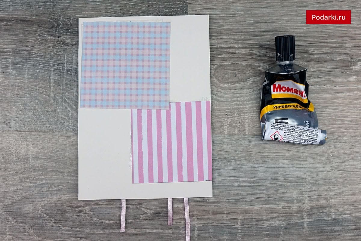 В будущей открытке ткань будет заменять цветную бумагу. Она крепится на основание в виде картона. Примечательно, что такое изделие выглядит достаточно интересно и приятно на ощупь. Для надёжной фиксации всех элементов на картоне лучше использовать канцелярский клей ПВА.