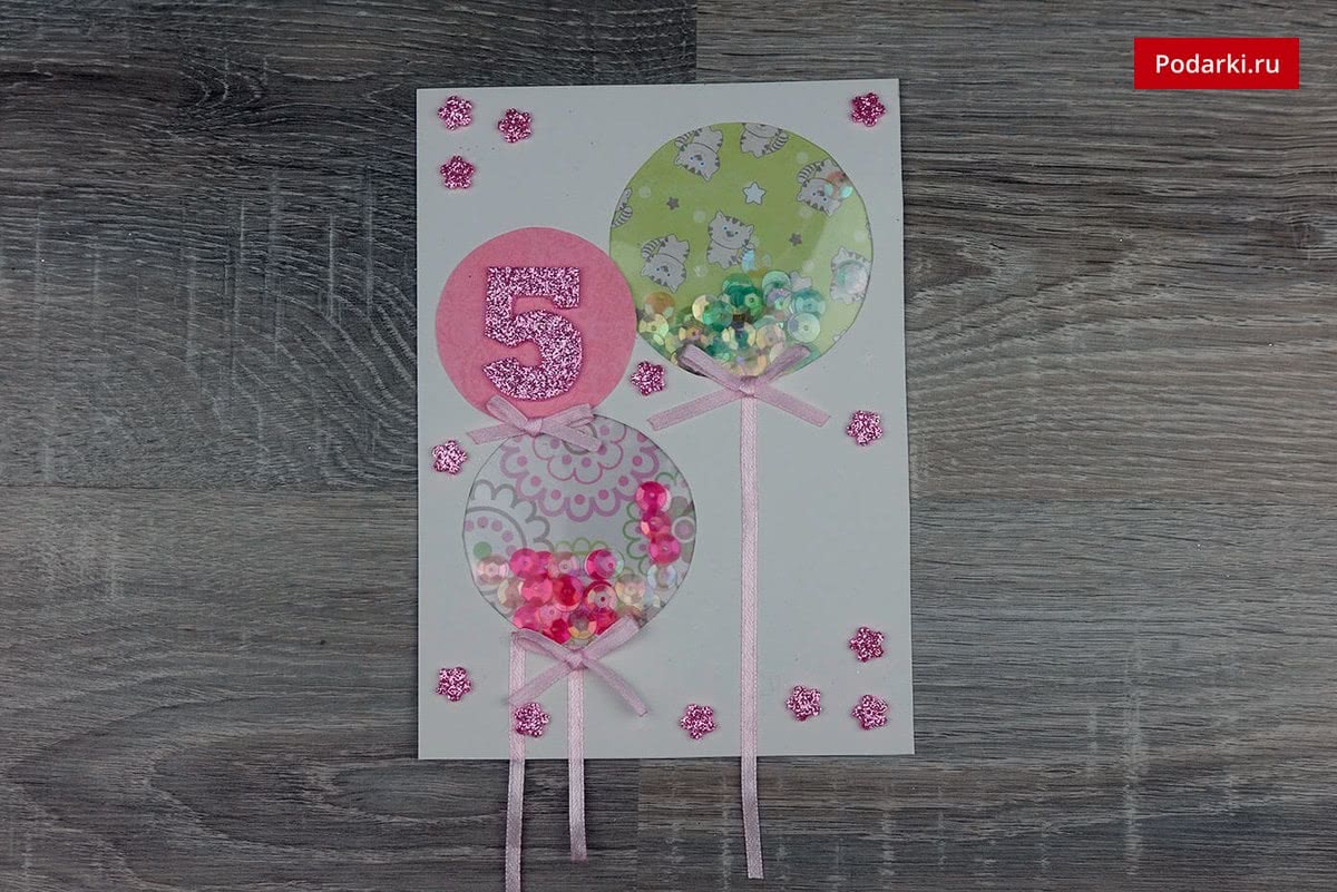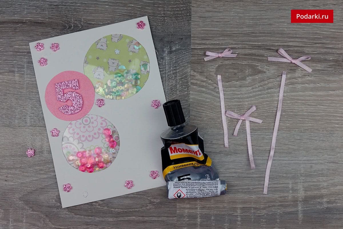 Приклеиваем бантики и ленточки таким образом, чтобы круги выглядели, как воздушные шарики.