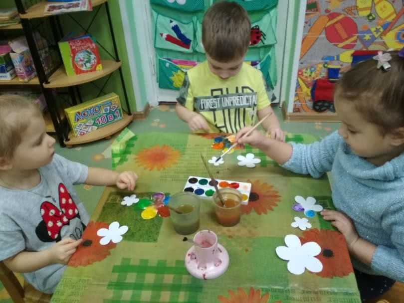 Настало время заняться клумбой. Облагородим ее цветами. Из цветной бумаги разных оттенков сделаем заготовки разнообразных форм и размеров. Посадим их на стебли с листочками. Разместим готовые детали на поляне. Можно дополнить композицию бабочками, водрузить на цветок осу.
