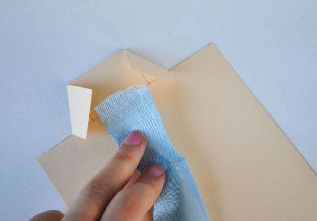 - Третий и четвертый белый и голубой листы бумаги размером 28х20 складываются пополам, после чего в середине (в районе складок) несколько раз прорезаются для создания четырех сквозных квадратов;
