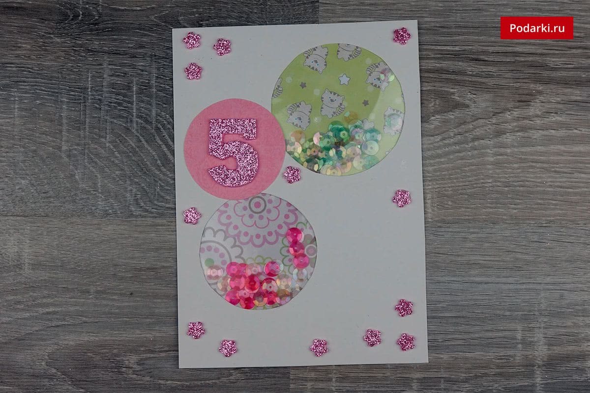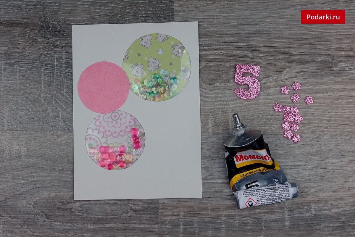 На круг приклеиваем цифру. Украшаем открытку цветочками по своему вкусу.