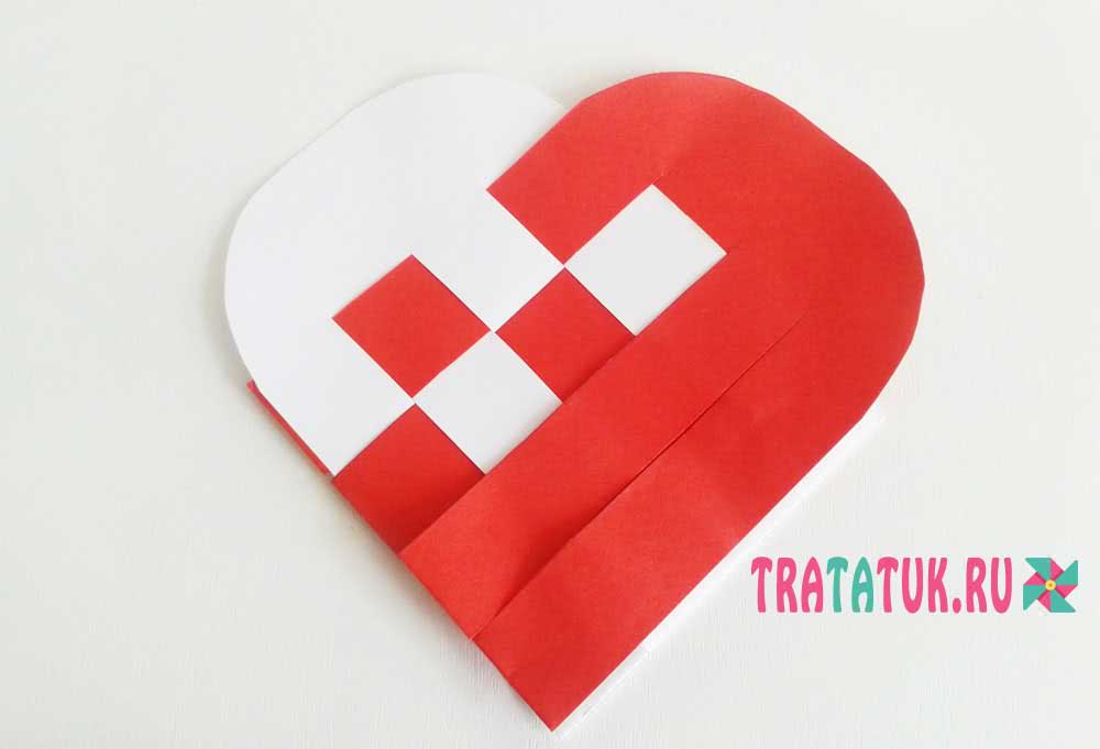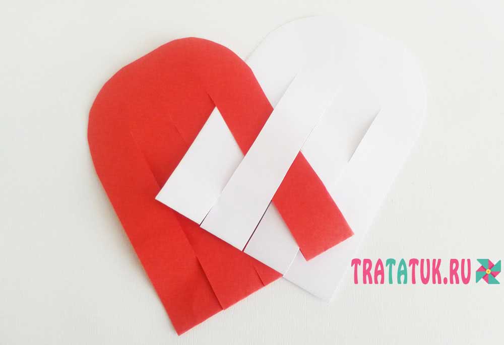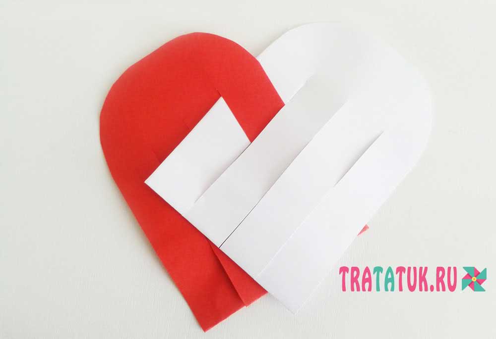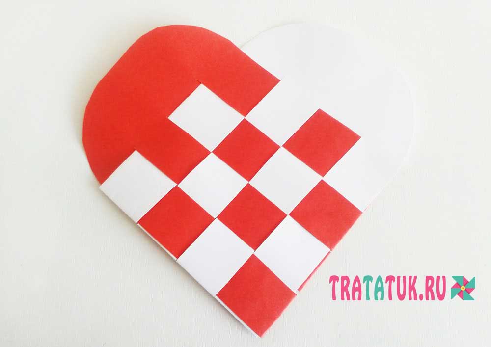 Но нам раскрытая не будет нужна, плетение будет проводиться сложенной бумагой. Если же нужна только «валентинка», а не сумочка, тогда плетут с одного разрезанного листа.